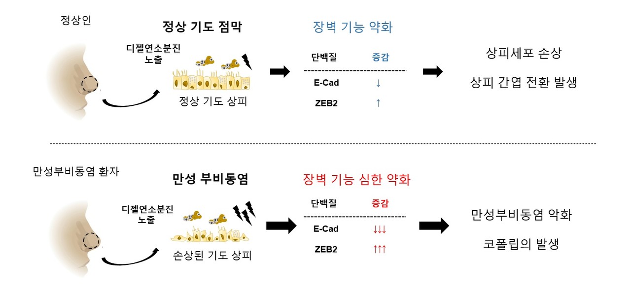 연구팀은 만성부비동염 환자가 디젤연소분진에 노출되면 ZEB2의 증가와 장벽 기능 감소로 콧속 물혹을 동반한 심한 만성부비동염으로 진행될 수 있다고 판단했다.